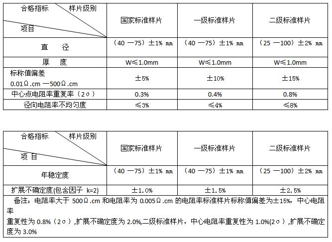 硅單晶電阻率標(biāo)準片(以下簡稱標(biāo)準樣片)是用高純多晶硅,經(jīng)過單晶設(shè)備,再經(jīng)中子嬗變摻雜等多種工藝制造的,具有一定幾何尺寸的實物標(biāo)準.由不確定度已知的標(biāo)準裝置,對該實物標(biāo)準的電阻率及其他指標(biāo)給予標(biāo)定,使用時以標(biāo)準樣片為準,對相關(guān)參數(shù)進行量值傳遞.