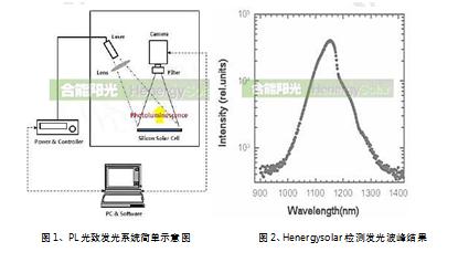 圖1是PL檢測系統(tǒng)的簡單示意圖,圖2是合能陽光公司的對(duì)晶體硅PL發(fā)光波峰檢測的結(jié)果,與理論一致,并且信號(hào)很強(qiáng)。