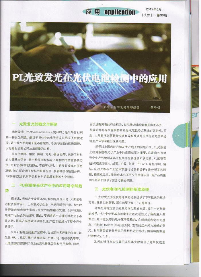合能陽光的PL檢測系統(tǒng)能夠適用于單晶硅片及電池、多晶硅片及電池、薄膜電池、化合物電池等幾乎所用的太陽能電池。能夠檢測少子壽命、串聯(lián)電阻、進(jìn)行硅片分類、檢測各種缺陷、暗條件I-V 曲線、光照條件I-V 曲線等完整的一系列參數(shù)。檢測速度快,時(shí)間小于1秒,精度高,能實(shí)時(shí)找到每個(gè)致效率降低的缺陷和原因,真正實(shí)現(xiàn)了在線的準(zhǔn)確快速檢測,是減低生產(chǎn)成本,提高電池品質(zhì),產(chǎn)品競爭力革命性增長的必不可少的檢測設(shè)備。