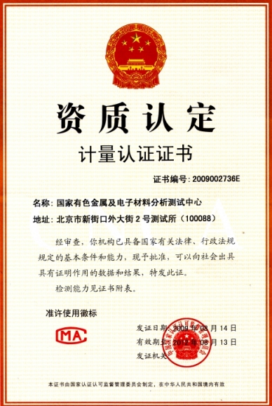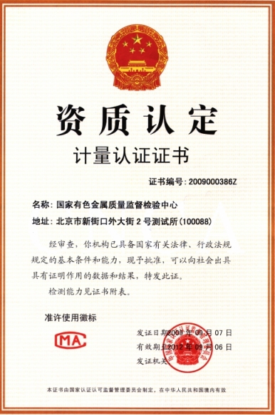 國(guó)家級(jí)資質(zhì)認(rèn)定計(jì)量認(rèn)證證書(shū),CMA 2009000386Z;