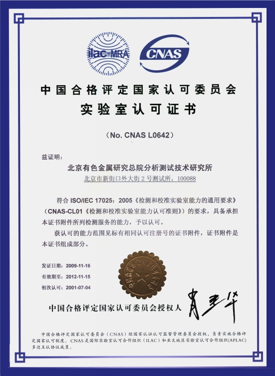 中國(guó)合格評(píng)定國(guó)家認(rèn)可委員會(huì)實(shí)驗(yàn)室認(rèn)可證書(shū),CNAS No. L0642;